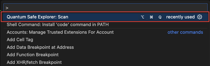 Press Ctlr-Shift-P to open the Command Palette and search for Quantum Safe Explorer. Select Quantum Safe Explorer Scan.