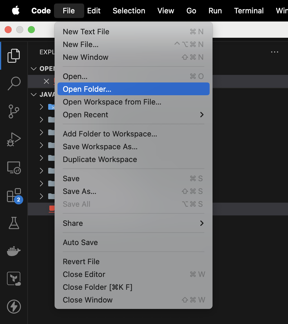 Navigate to the File menu drop down, select the Open Folder to locate your /<package-path> folder: