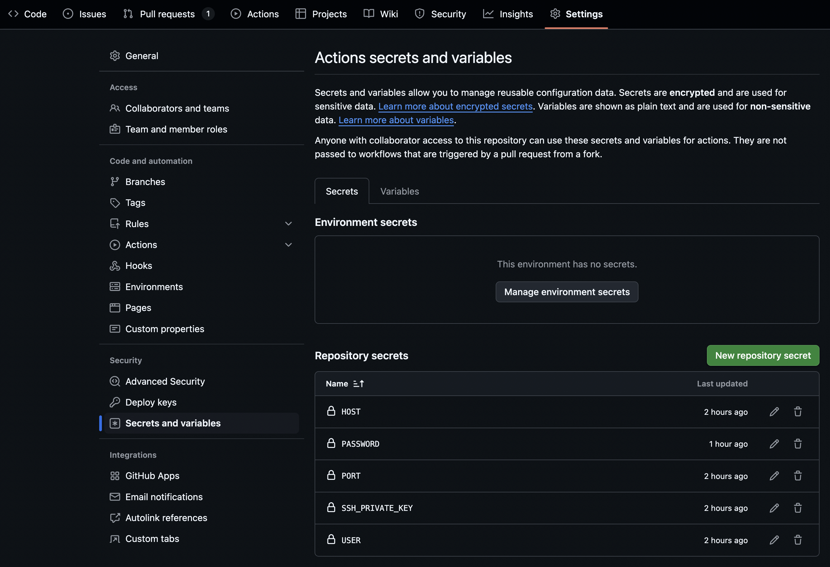 - In your action repo, add the following secrets by navigating to Settings->Secrets and variables and clicking on New repository secret: