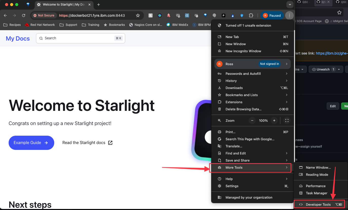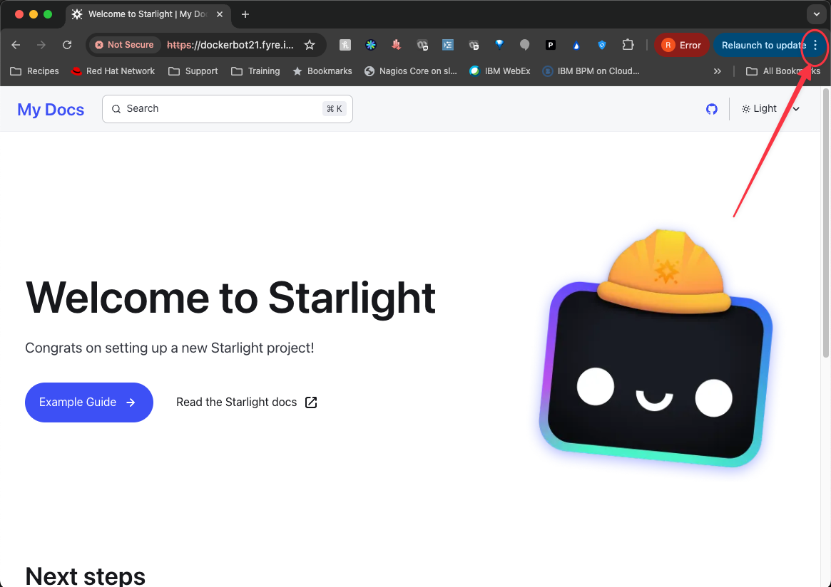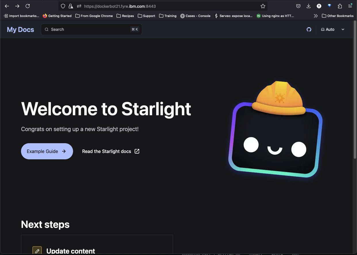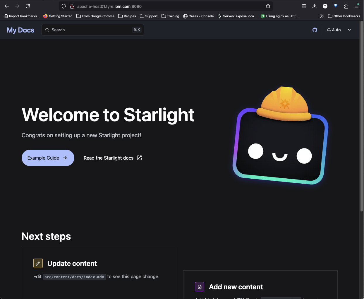 If you created the “Hello world” test site then you will see a simple site that says “Hello world!” instead of the “Welcome to Starlight” page shown above, but the instructions will be the same.