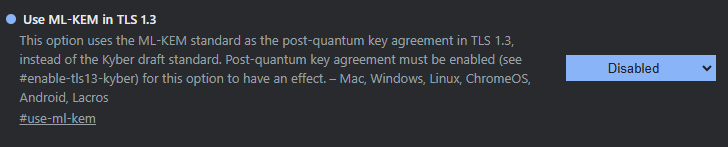 Depending on the scenario, it could be desirable to either enable or disable kyber encryption for the browser. For example, if the scenario is a legacy encryption client connecting to a quantum-safe kyber encrypted application or site, then the kyber encryption would need to be disabled on the browser. The vice versa would also be true for a scenario where kyber encrypted clients are connecting to a legacy encrypted application or site.